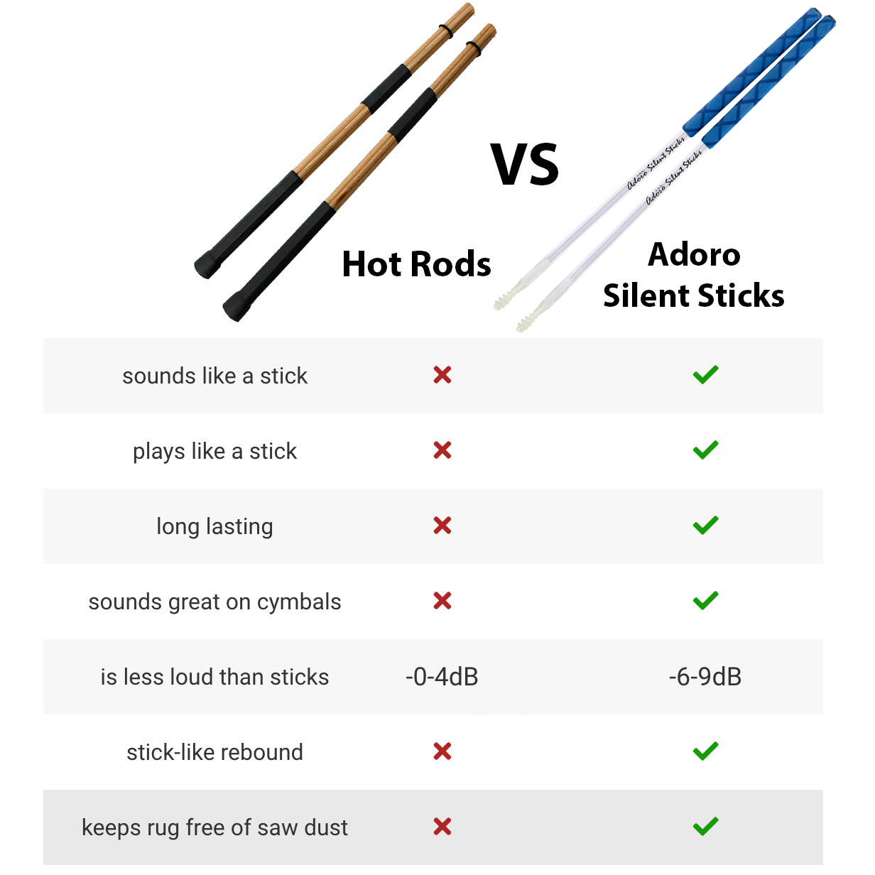 Avec les Silent Sticks, plus besoin de cages en plexi coûteuses, de batteries électroniques ou d'amplification. Réduisez votre volume de moitié.